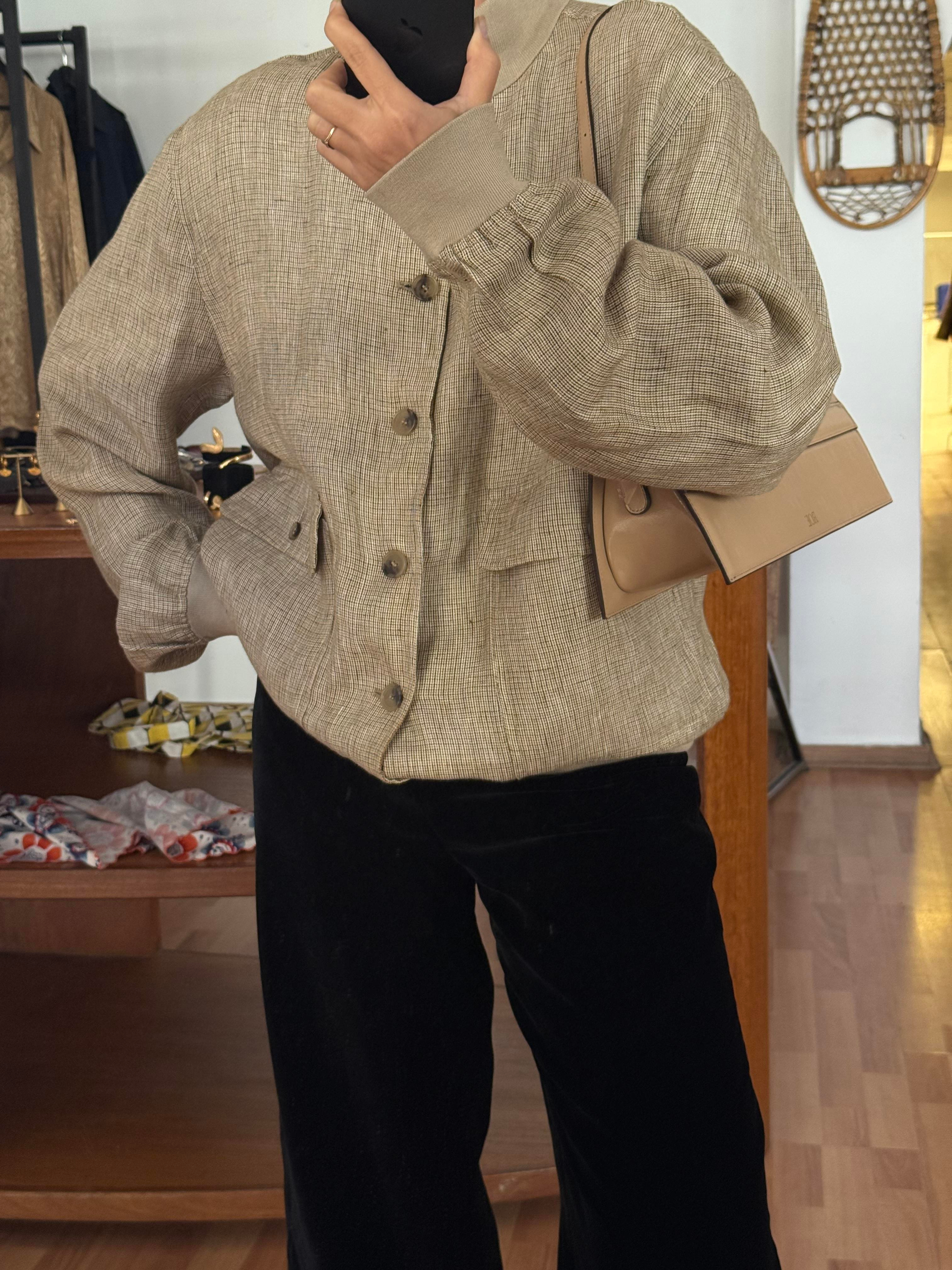 Vintage bej renkli, cupro kumaşlı bomber ceket.