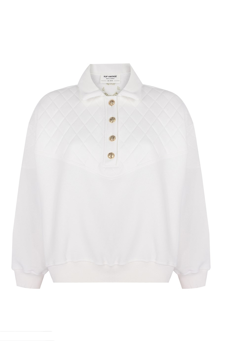 Göğsü ve omuzları çift kat kumaştan kapitone dikişli, yakalı, dört adet altın ton düğmeli, oversize sweatshirt.