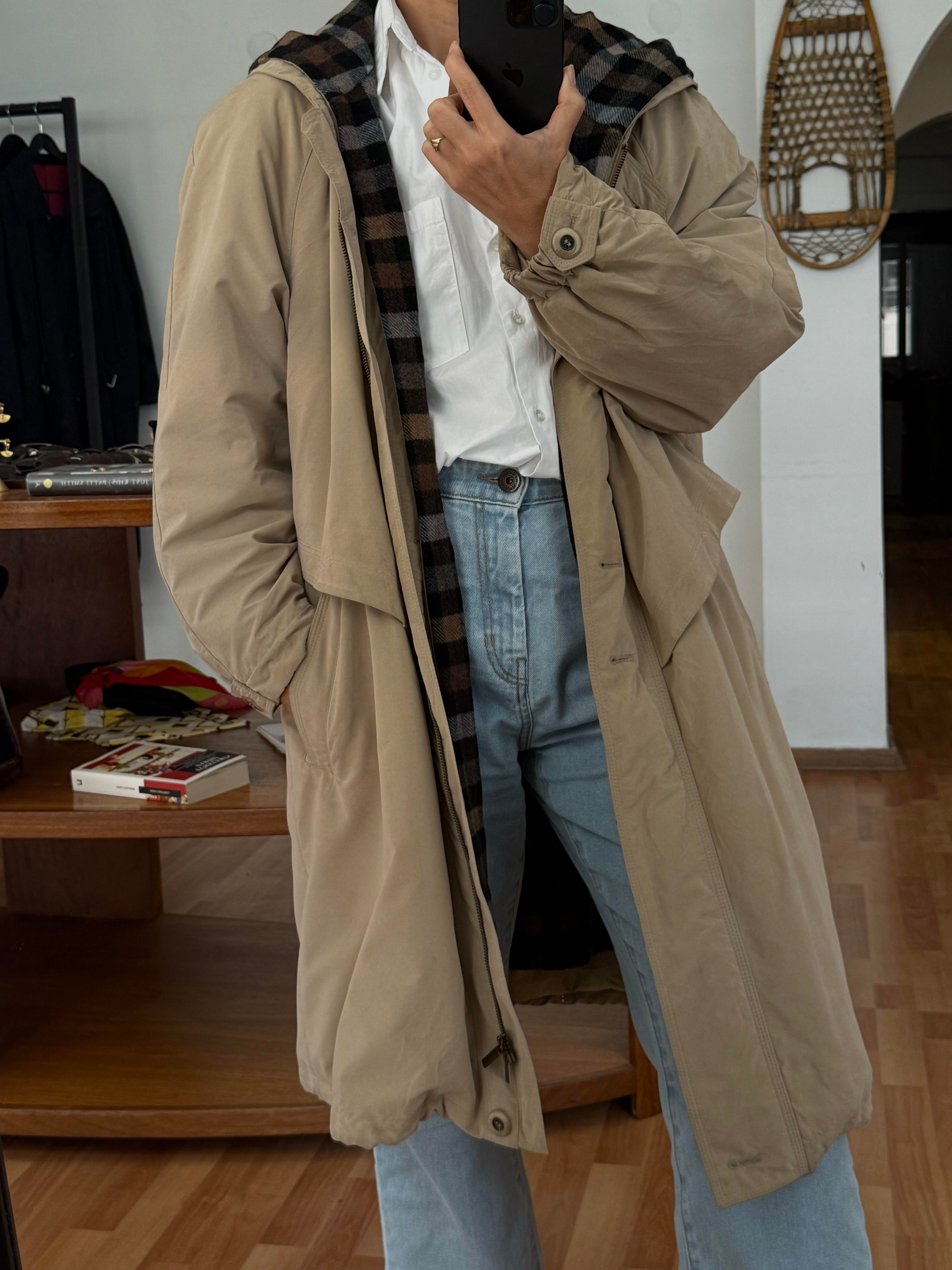 Bej tonlarındaki kapüşonlu uzun mont, fonksiyonel detayları ve rahat kesimiyle öne çıkıyor. Çıkarılabilir kapüşon astarı ve koruyucu formuyla hem şehirde hem hafta sonu kombinlerinde pratik bir seçim.Vintage bej renkli yazlık-kışlık 2 astarlı oversize unisex trençkot.