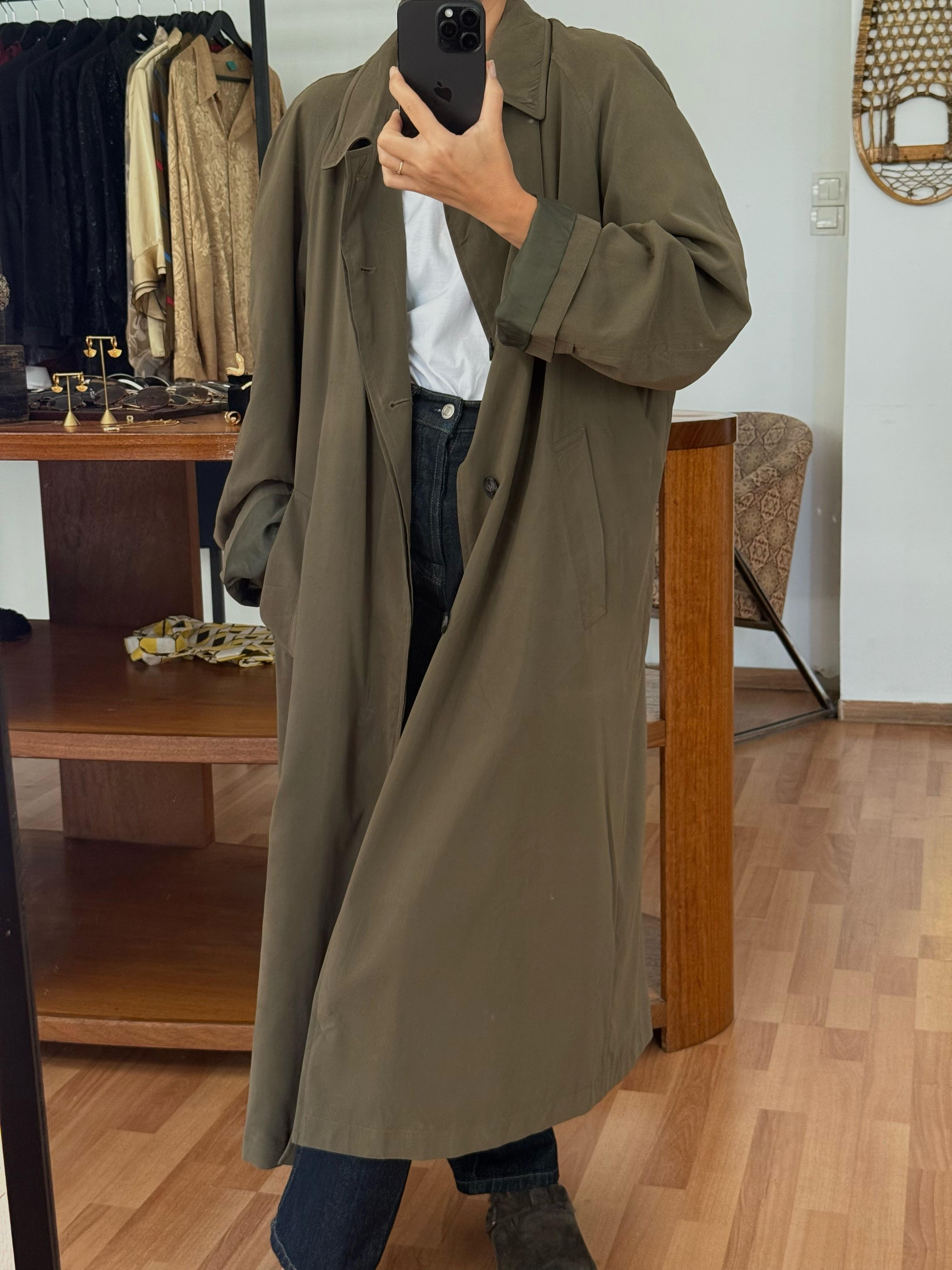 Vintage haki renkli oversize trençkot.