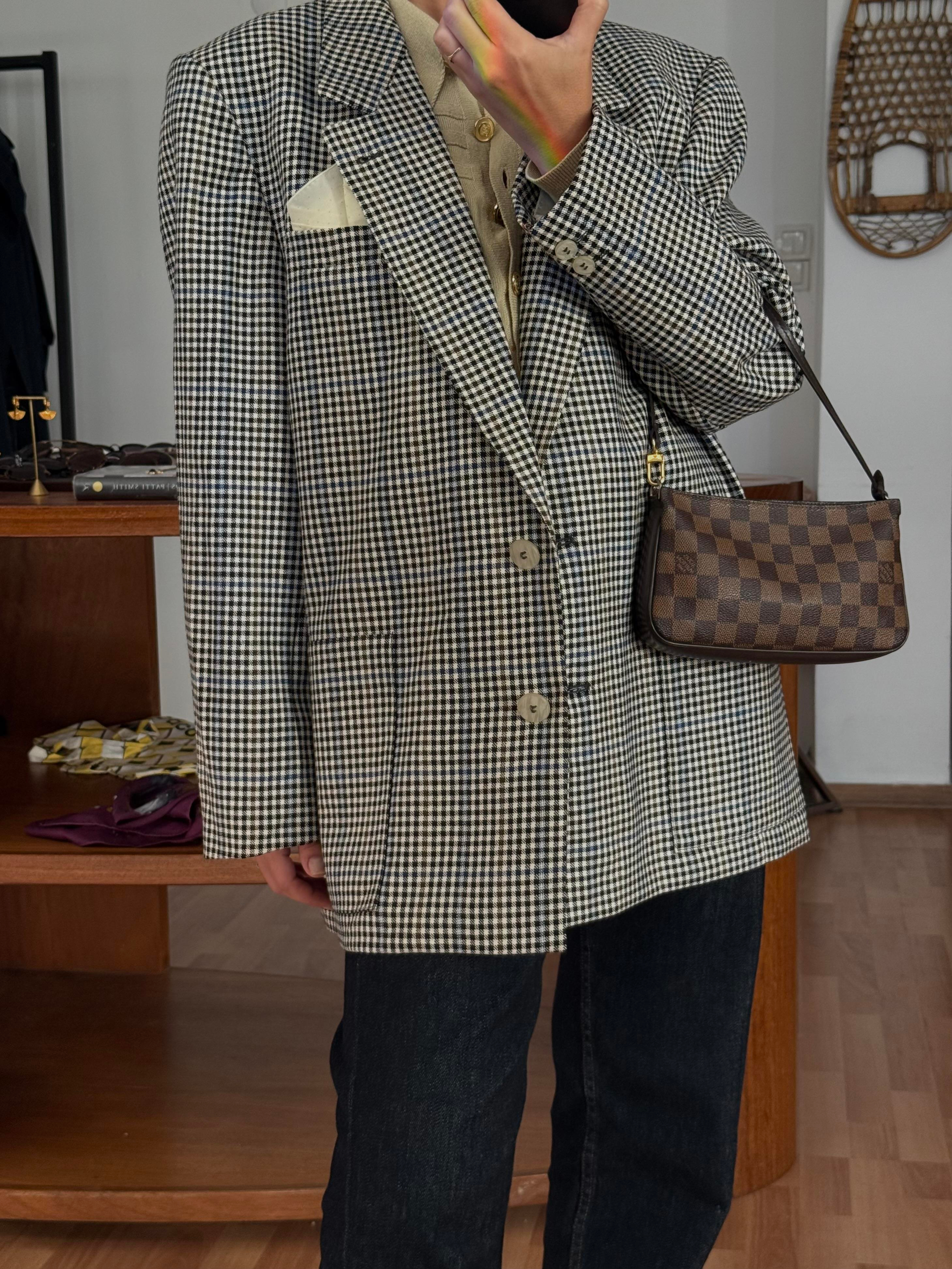 Westbury imzalı bu vintage blazer, ekose desenin zamansız şıklığını güçlü bir siluetle birleştiriyor. İki düğmeli kapanışı, zarif yaka kesimi ve iç astarındaki markaya özel etiket detayıyla öne çıkan bu parça, hem gündüz hem gece kombinlerinde sofistike bir duruş kazandırıyor. Ekose deseninin siyah, beyaz ve mavi tonları ile klasik görünüme modern bir dokunuş eklenmiş. Gardırobunuza hem ofis şıklığı hem de şehir hayatı için joker bir parça olarak dahil edebilirsiniz.