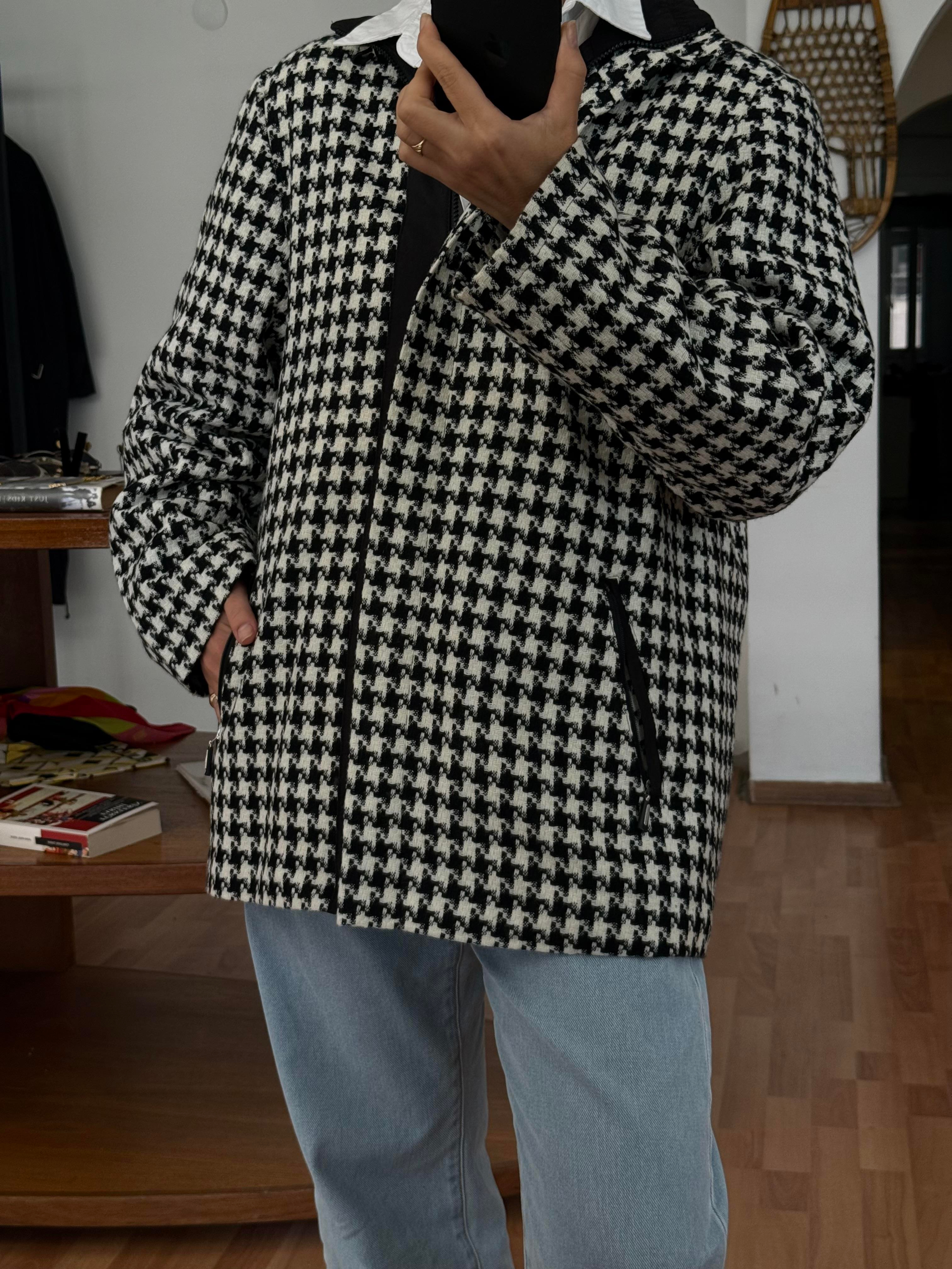 Siyah-beyaz kazayağı desenli bu ceket, yüksek yakası ve fermuarlı kapanışıyla hem şık hem de fonksiyonel bir görünüm sunuyor. Minimal detaylarıyla farklı kombinlere uyum sağlayan zamansız bir parça.